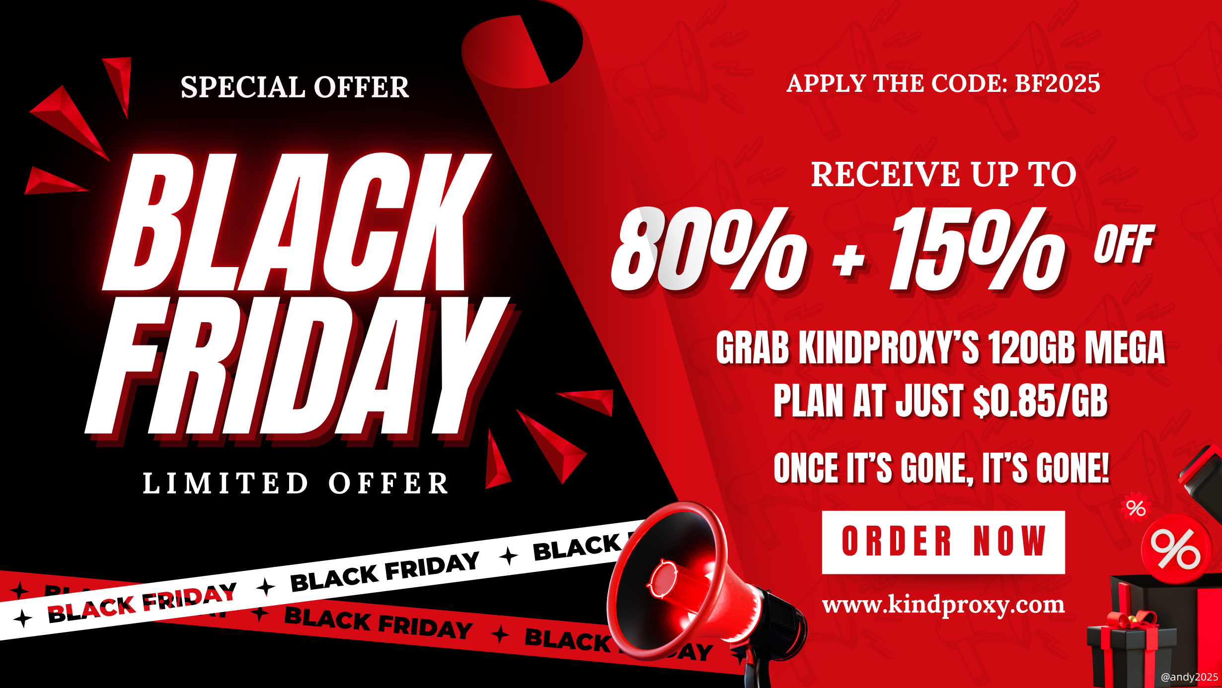 朋友们,黑五优惠活动等你领取,只需 3 步: 访问官网 KindProxy.com ,选择任意套餐(包含 120GB Mega Plan), 系统自动应用 15% OFF,无需优惠码,永不担心错过。